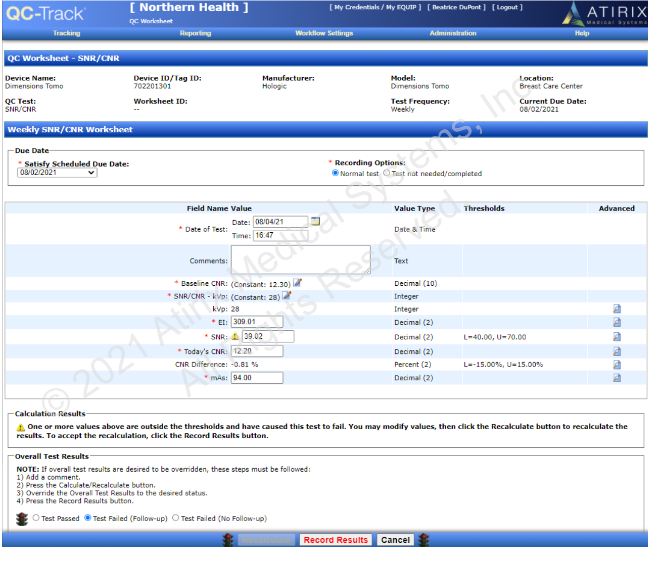 Any field values that fall outside pre-defined thresholds are highlighted, and QC-Track provides coaching on the fields that are failing. The technologist