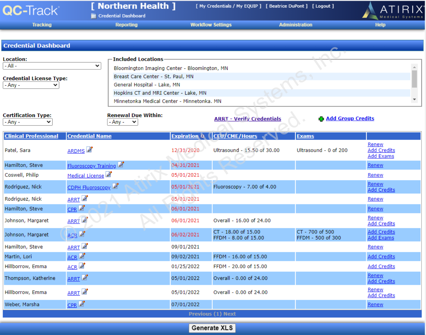 QC-Track.Credentials - Enhanced includes all of the capabilities of the Standard offering and adds detailed tracking for CEU/CME and exam count by modality. The point-in-time and rolling window tracking features simplify compliance with the ACR’s continuing education requirement and automatically identify and notify personnel of expiring credentials.